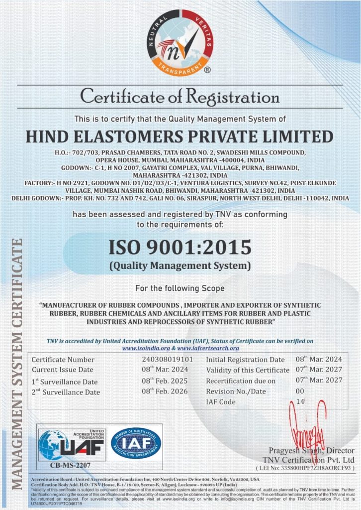 Hind Elastomers Pvt Ltd was established in 1992 and INDIA’s leading Importer of Rubber Raw Materials. Our Head office is in Mumbai and branches in Delhi, Kolkata & Pune. Our Warehouses & Plant are located at Bhiwandi (Mumbai) & Delhi. We have a Rubber reprocessing facility situated at Bhiwandi. Which is hardly 67 km from Nhava Sheva port. This gives us a very big advantage for exporting materials.
